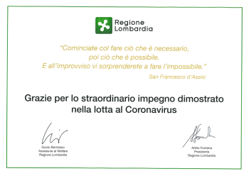 Grazie da Regione Lombardia per l’impegno dimostrato nella lotta al Coronavirus.
